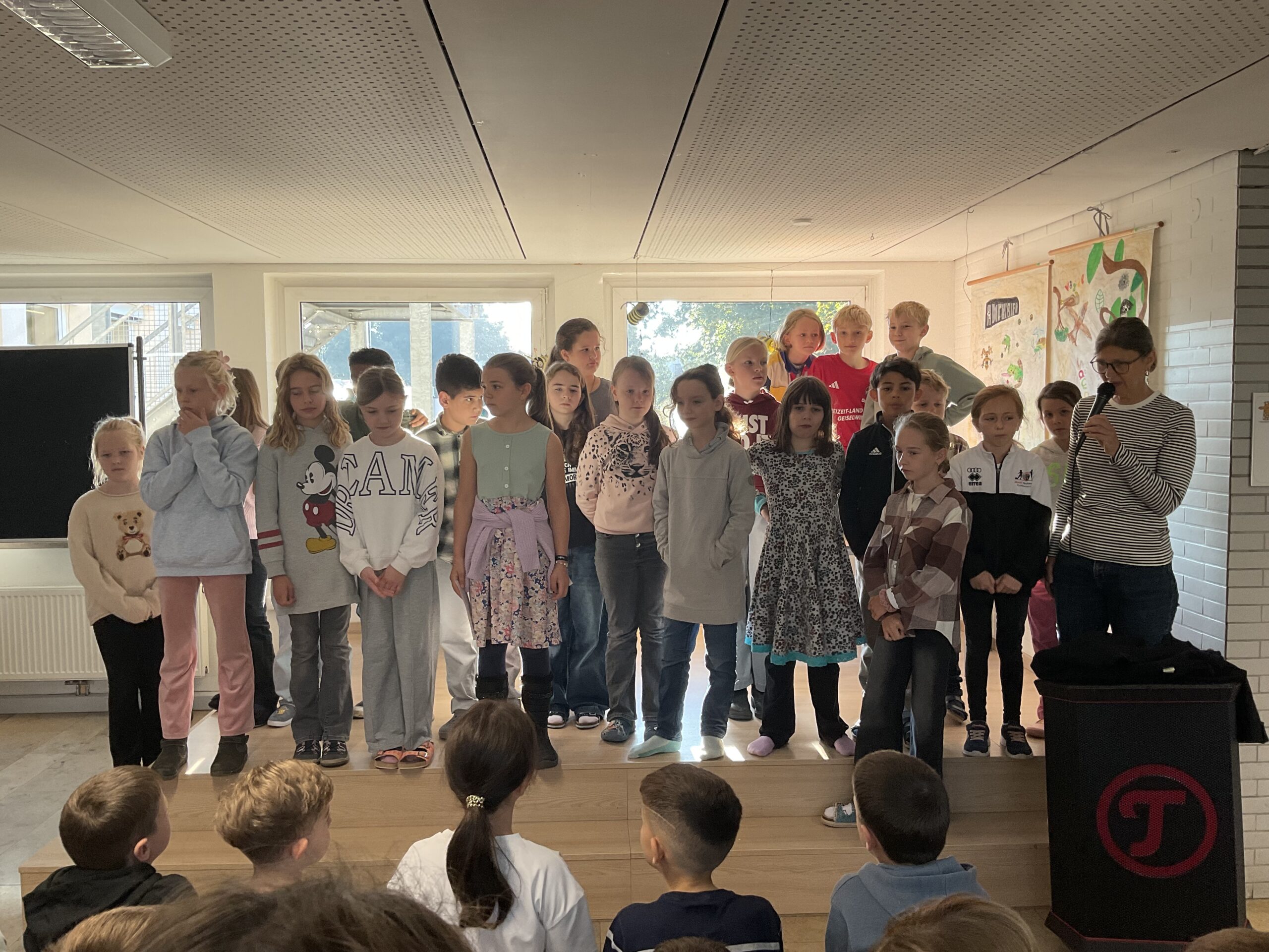 Die Übergabe wurde musikalisch begleitet: Mit einem fröhlichen Herbstlied stimmten die Erst- und Zweitklässler auf die besondere Aktion ein, bevor sie stolz ihre Kunstwerke präsentierten. Jede Tüte wurde individuell bemalt – farbenfroh, fantasievoll und mit viel Herzblut gestaltet.
