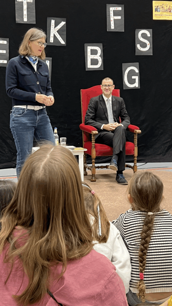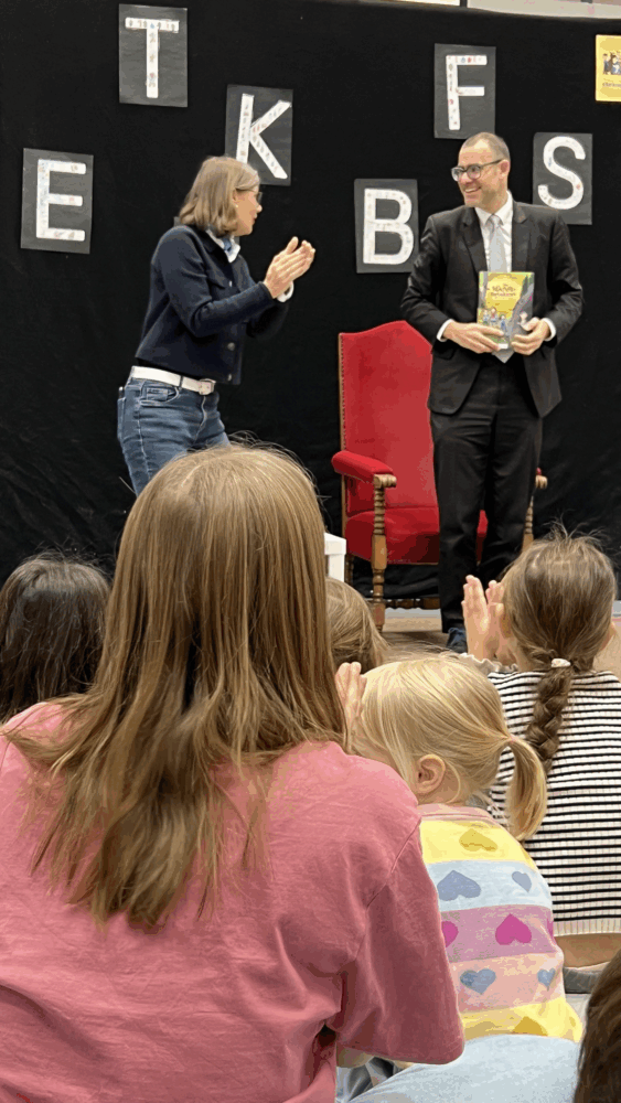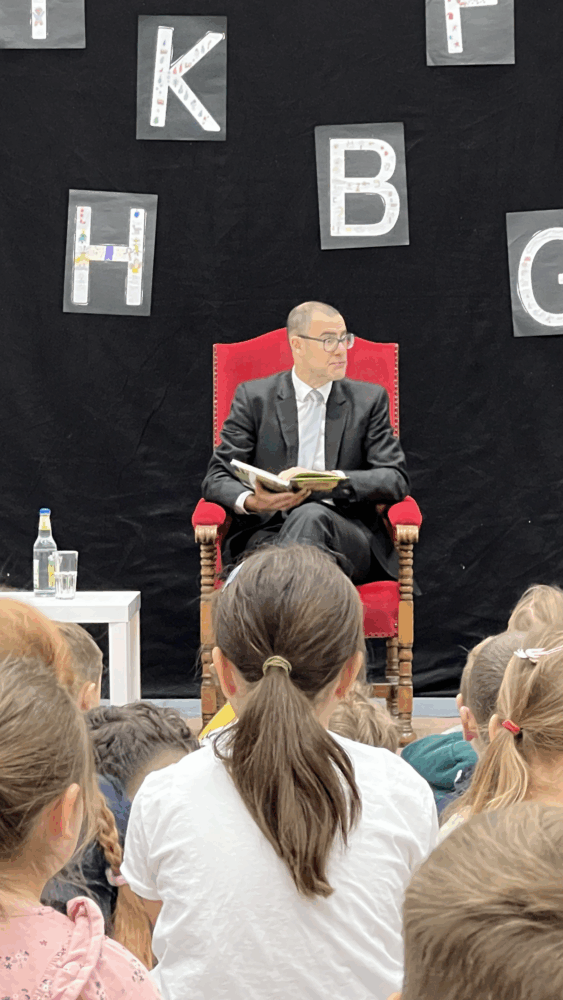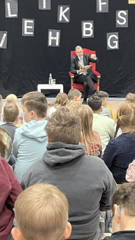 Anschließend stellte der Bundestagsabgeordnete Ralph Edelhäußer das Buch „Die Naturdetektive: Abenteuer in der Fledermaushöhle“ vor und las mit großer Begeisterung daraus vor. Die Kinder der ersten und zweiten Klassen lauschten gespannt der spannenden Geschichte rund um geheime Spuren und mutige Naturforscher.
