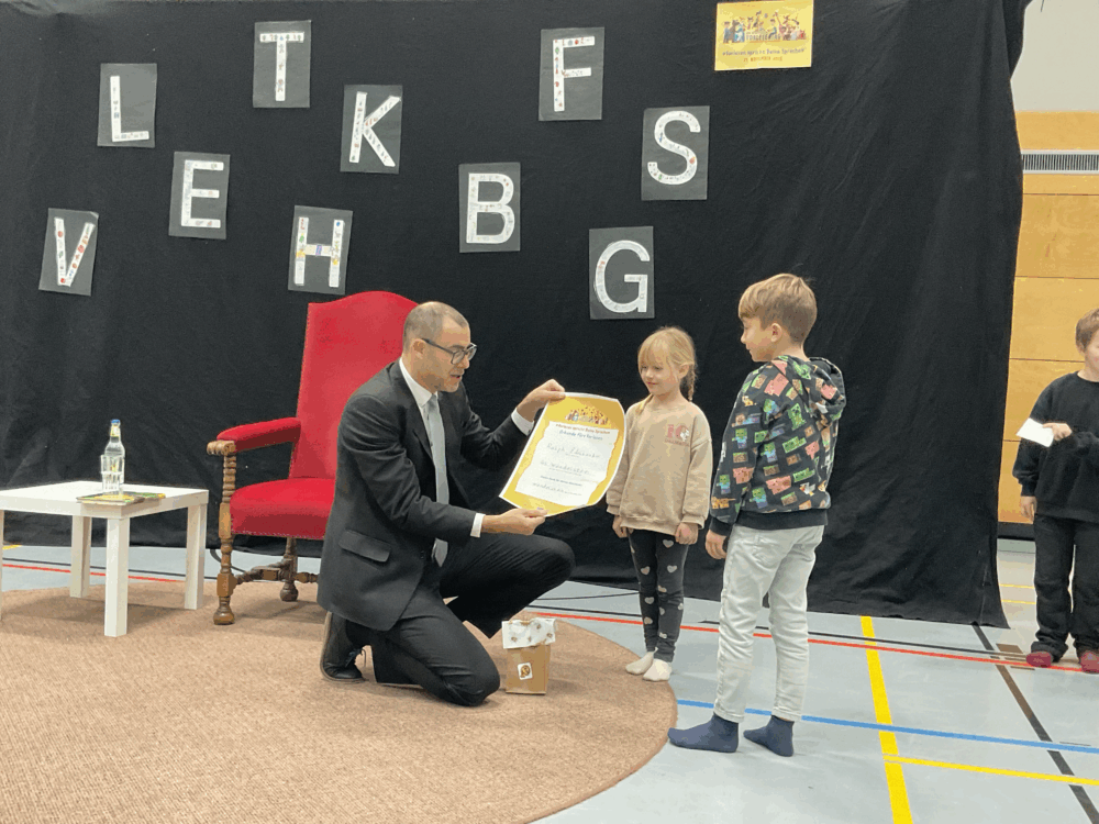 Zum Abschluss übergaben zwei Kinder ein kleines Dankeschön: Ein Glas unseres schuleigenen Honigs sowie eine Vorlese-Urkunde. Die Freude war auf beiden Seiten groß.